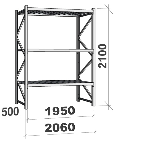 The kit includes2 side frames2100x500 and 3 shelf levels1950x500 with heavy duty steel beams, modular galvanised steel panel sections & safety locking pins.