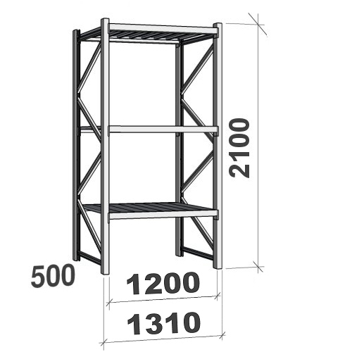 Varastohylly perusosa 2100x1200x500 600kg/hyllytaso,3 tasoa peltitasoilla