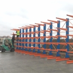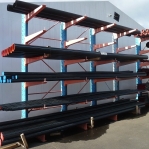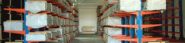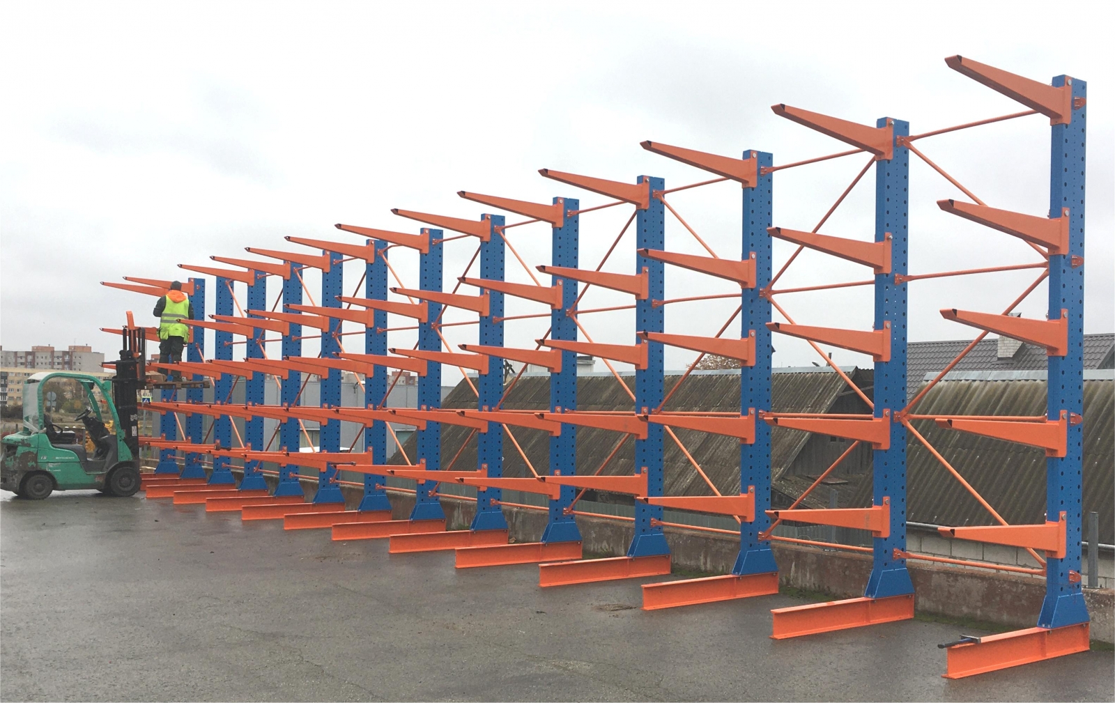 Cantilever racks are designed for the effective storage of goods such as wooden boards or pipes, separation of standing long goods. Due to the possibility of double-sided suspension or use, cantilever racks are characterized as space-saving racks that meet almost every requirement in your warehouse. You can buy cantilever racks in our store in two versions : HEAVY rack - steel powder coated upright in blue, cantilever arms in orange or MEDIUM rack - fully galvanized sheet metal. We realize also individual cantilever racks on request in the form of custom-made products - especially for your individual needs. Please take into account that this may result in longer delivery times. The single-sided or double-sided cantilever racks can be fixed to the floor with the help of bolt anchors. Due to the modular design, you can also expand single-sided and double-sided cantilever racks with additional arms or bays at a later date. The arm load, or the load capacity, of HEAVY cantilever racks for the quick delivery ranges from 800 kilograms to 1200 kilograms, the standard height 4 to 5 meters. The adjustment step of the cantilevers is 100 mm.